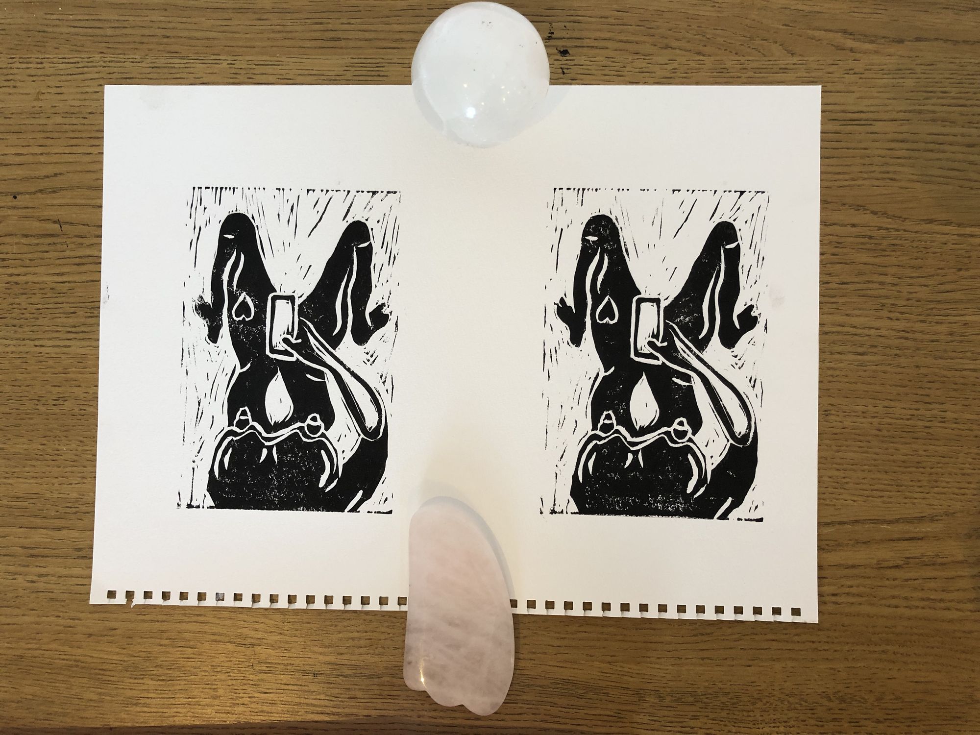 Here is the Yoni Phone being charged by the crystal ball and a rose quartz gua sha.